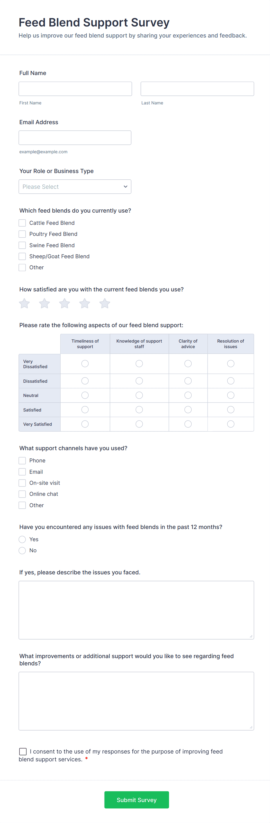 - Multiple choice and rating scales for satisfaction or feature evaluation.