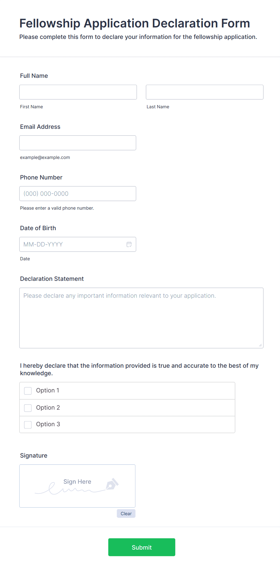 • For job applications, include fields for personal information, education, work experience, references, and file uploads for resumes or cover letters.