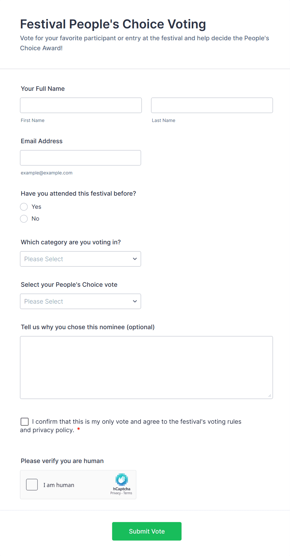 Voting forms are used by schools, businesses, clubs, nonprofits, event organizers, and any group needing to make collective decisions or gather opinions.