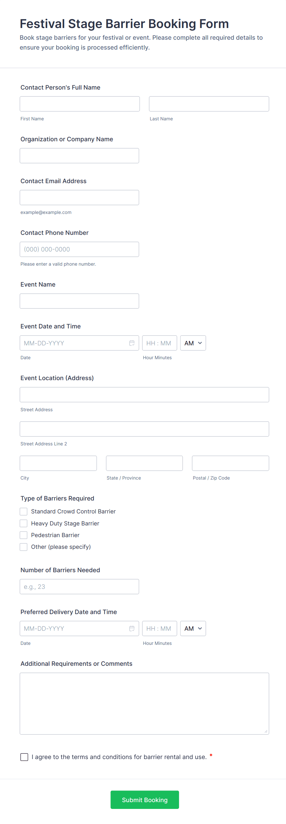 Event Booking Forms are specialized online forms designed to streamline the process of reserving spots, tickets, or services for various events. Whether you’re organizing a conference, workshop, concert, sports tournament, or private party, these forms help collect essential attendee information, manage RSVPs, and process payments or deposits. Event organizers, venues, and service providers use event booking forms to simplify registration, track attendance, and ensure a smooth experience for both hosts and guests. The forms can be tailored to suit different event types, from small gatherings to large-scale public events, making them a versatile tool for anyone managing bookings.