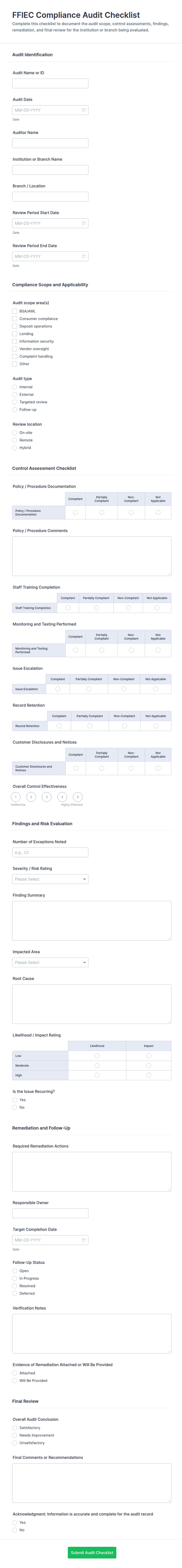 - Multiple choice or checkbox fields for compliance checks.