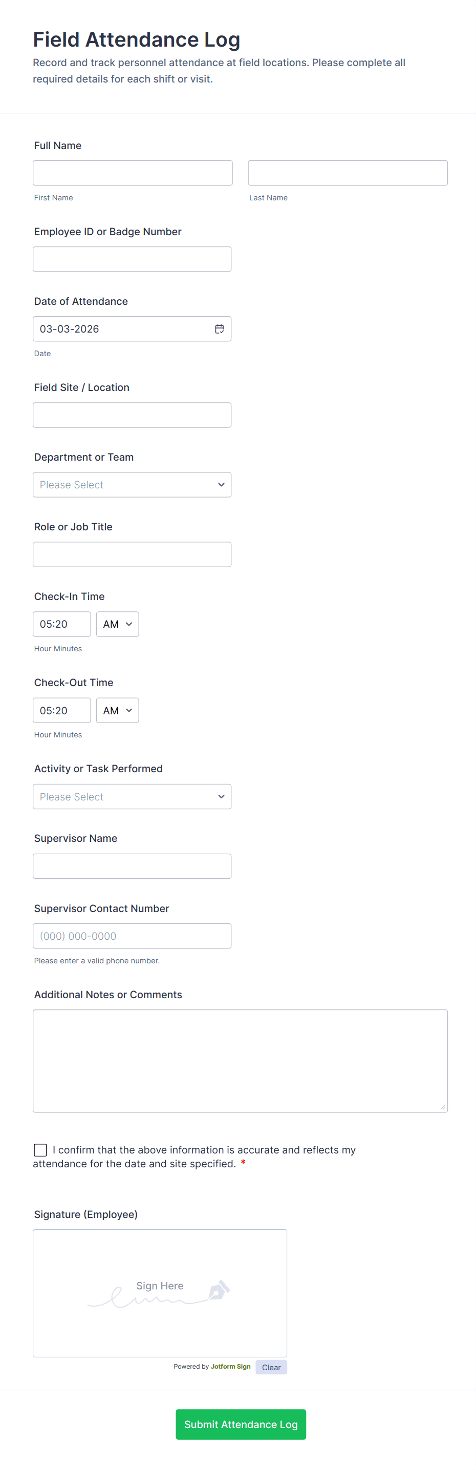 Manage your classroom’s attendance records online. Easy-to-customize online form. Fill out on any device. Track in Jotform Tables. Connect with 100+ apps.