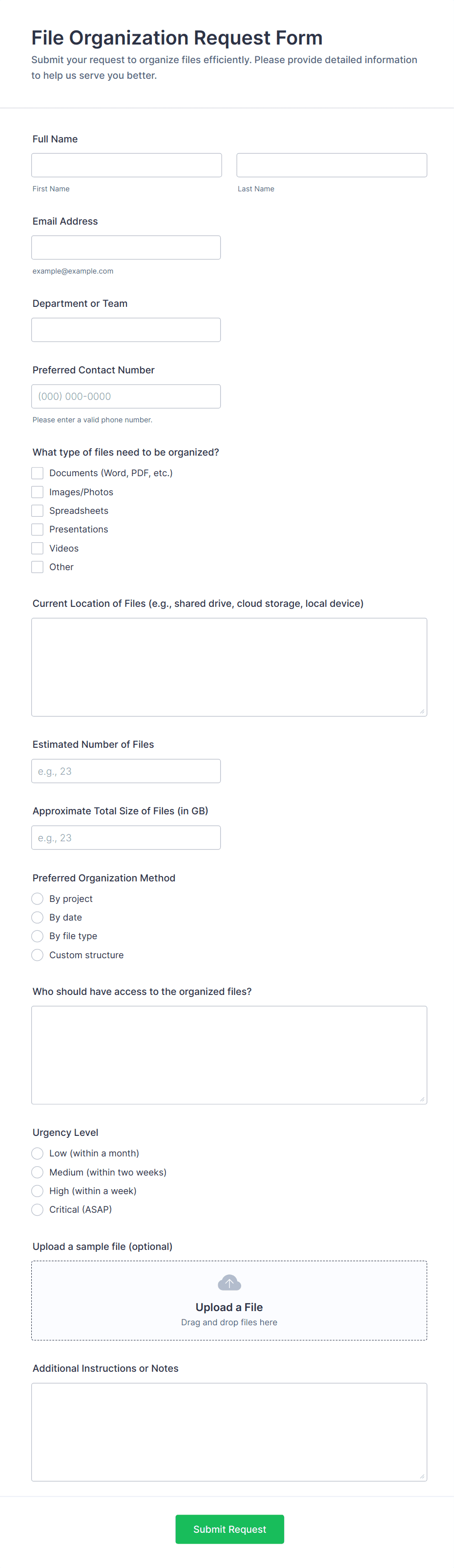 Common fields include requester’s name, contact details, department, type of request, detailed description, urgency, and any relevant attachments.