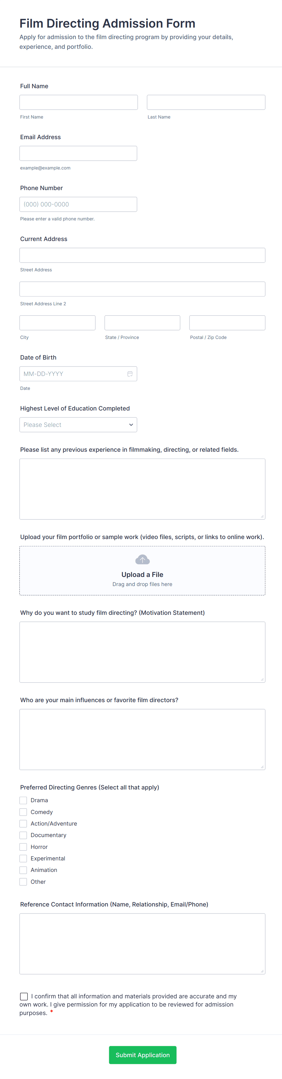 • For job applications, include fields for personal information, education, work experience, references, and file uploads for resumes or cover letters.