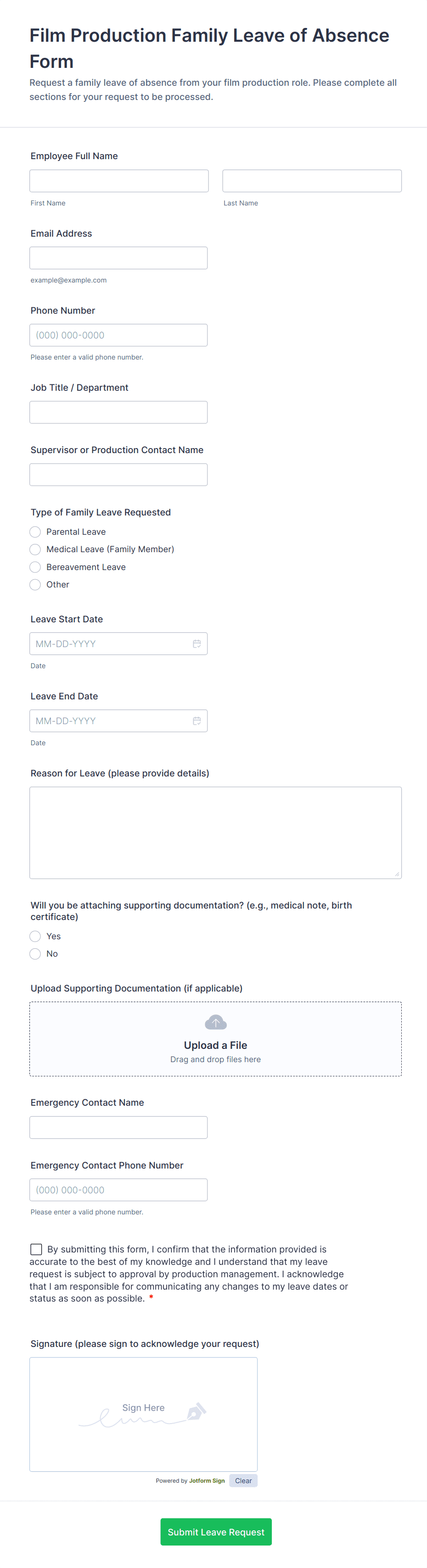 The template allows getting instant leave requests from employees with all relevant information that is needed. You can add more customized fields with Jotform.