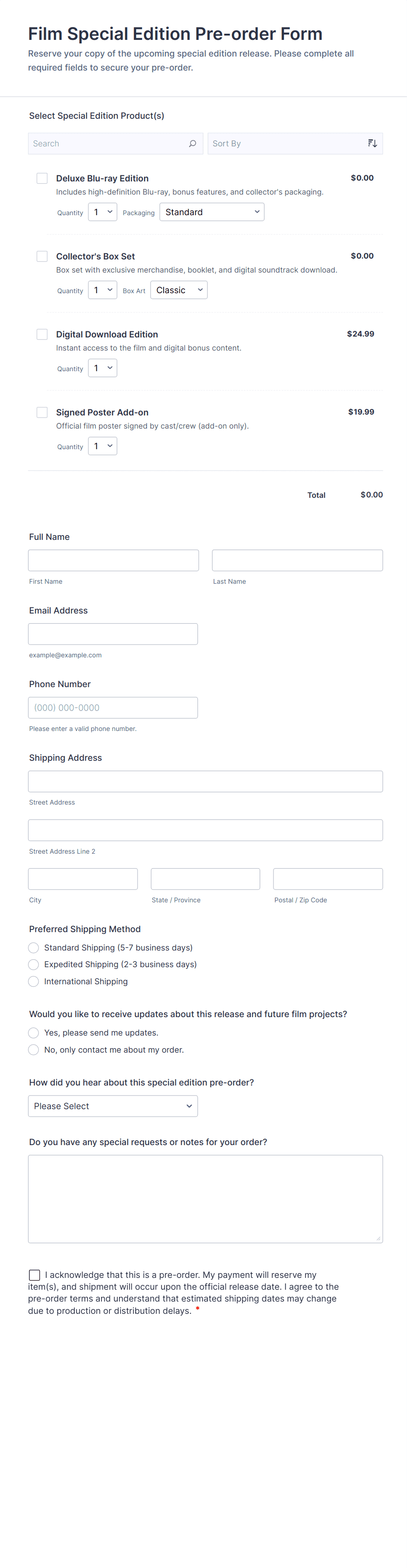 Preorder forms are specialized online forms designed to collect advance orders for products or services before they are officially released or available for general sale. Businesses, creators, and organizations use preorder forms to gauge demand, secure early sales, and streamline inventory planning for upcoming launches. These forms are commonly used for new product releases, limited-edition items, event tickets, seasonal goods, or even digital content. By allowing customers to reserve or purchase items ahead of time, preorder forms help businesses manage expectations, reduce the risk of overproduction, and build excitement around new offerings.