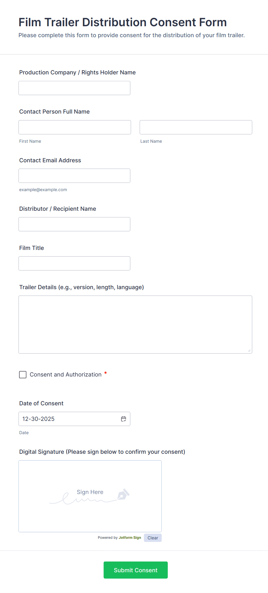Film Trailer Distribution Consent Form helps production companies and rights holders capture trailer details, obtain distribution authorization, and collect dated digital signatures from distributors or partners online.