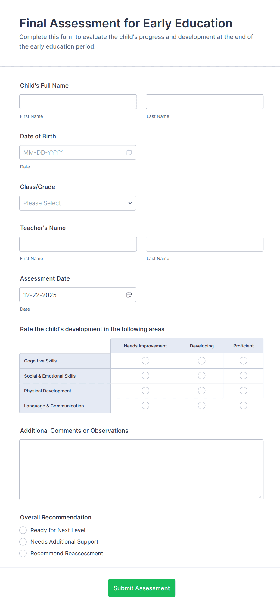 Use the Teacher Aide Conduct Assessment Form from Jotform to rate conduct, record strengths and areas for improvement, and track overall performance with a no-code form builder and easy data collection.