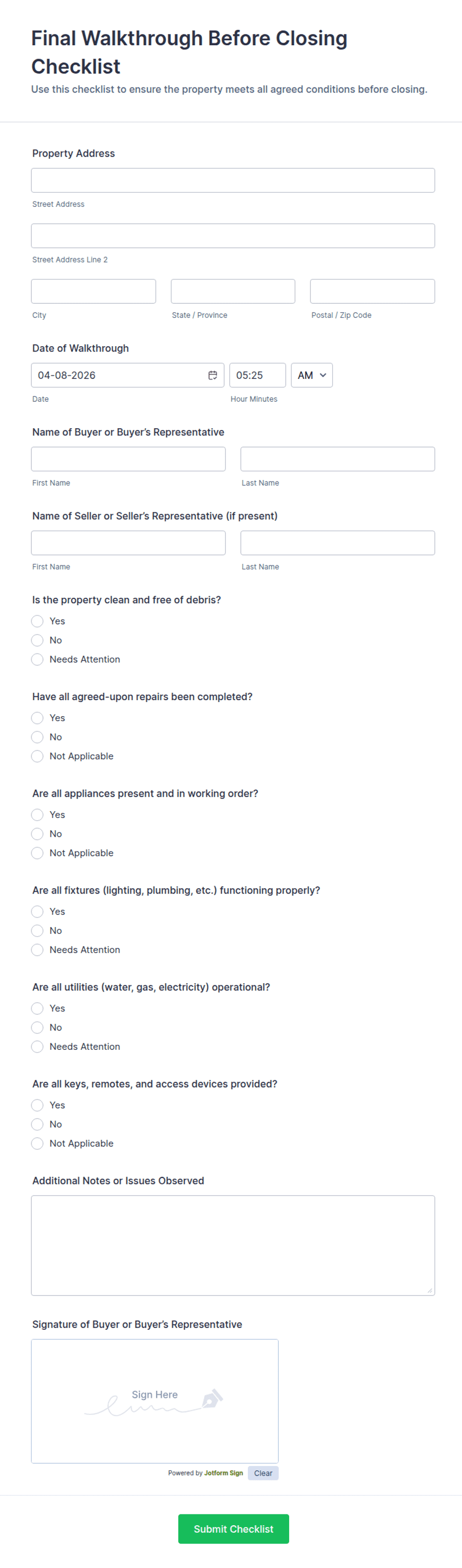 By following these steps, you can create a checklist form that streamlines your processes, ensures consistency, and provides valuable documentation for compliance or reporting. Jotform’s flexibility allows you to adapt your checklist forms as your needs evolve, making it a powerful tool for ongoing task management.