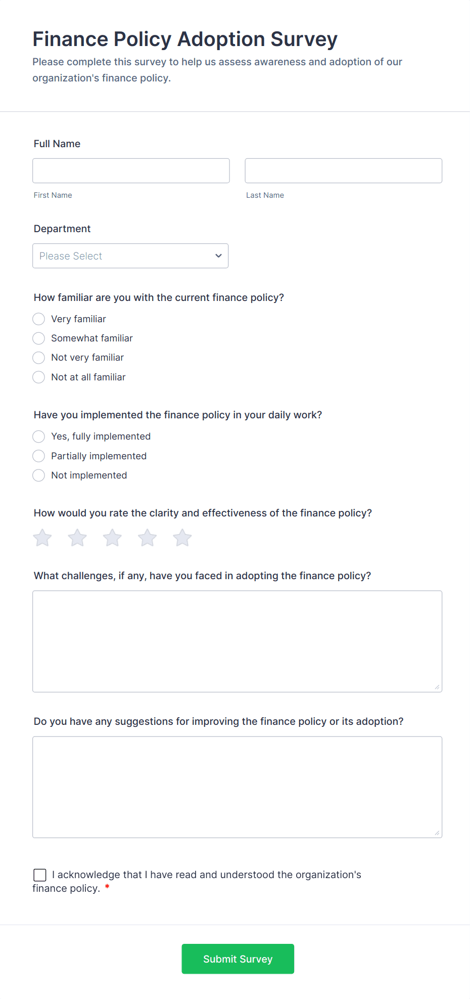 For employee surveys, consider adding anonymity options; for customer surveys, include contact fields if follow-up is needed.