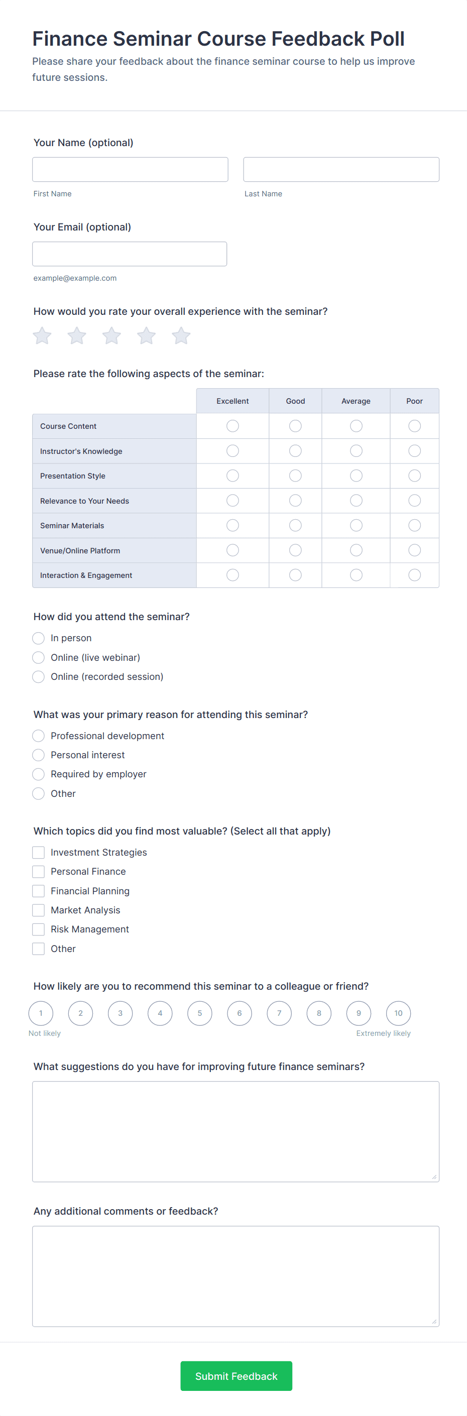 - Workshop feedback forms might focus on session relevance, hands-on activities, and logistics.