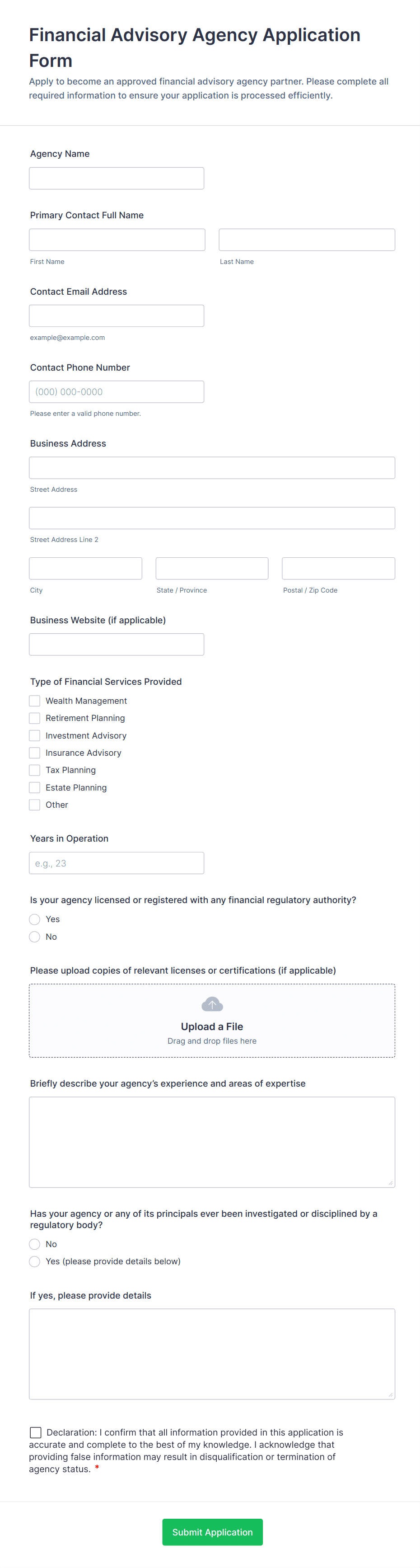 Give your clients peace of mind with Jotform’s secure online Financial Advisor Forms. From any device you can gather client intake information, W4 and W9 data, and finance declaration forms and applications. Choose from one of our free form templates below, and customize it to make it your own without any coding with just a few clicks. Drag and drop to edit premade text fields and checklist items, add your own personal branding, install widgets, choose fonts and colors, and more. You can also charge clients directly from your form with our 30+ payment processor integrations — which charge no additional transaction fees. Sensitive client information is instantly synced and stored in your secure online account. Create a seamless intake process for your clients with our free Financial Advisor Forms.