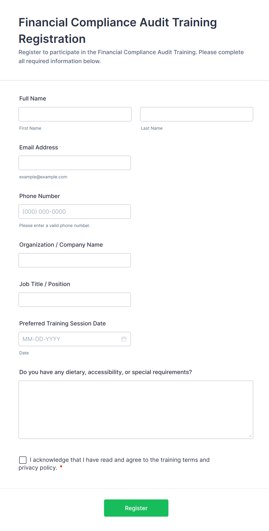 A Training Registration Form is a user-friendly form template designed to streamline the registration process for training providers, corporate HR teams, nonprofits, and event management teams.