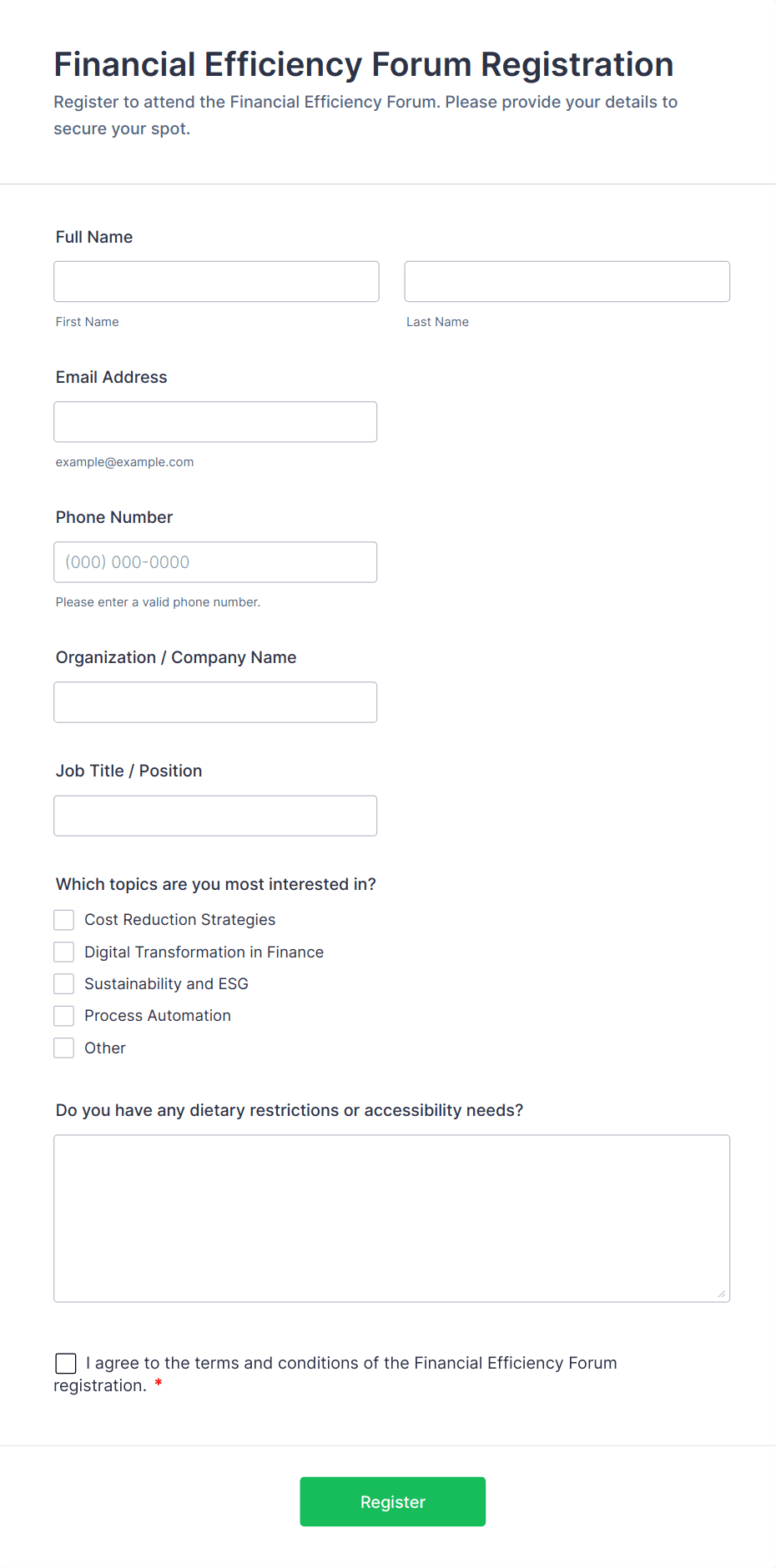 • For speaker or exhibitor forms, add fields for presentation topics, company details, or booth preferences.