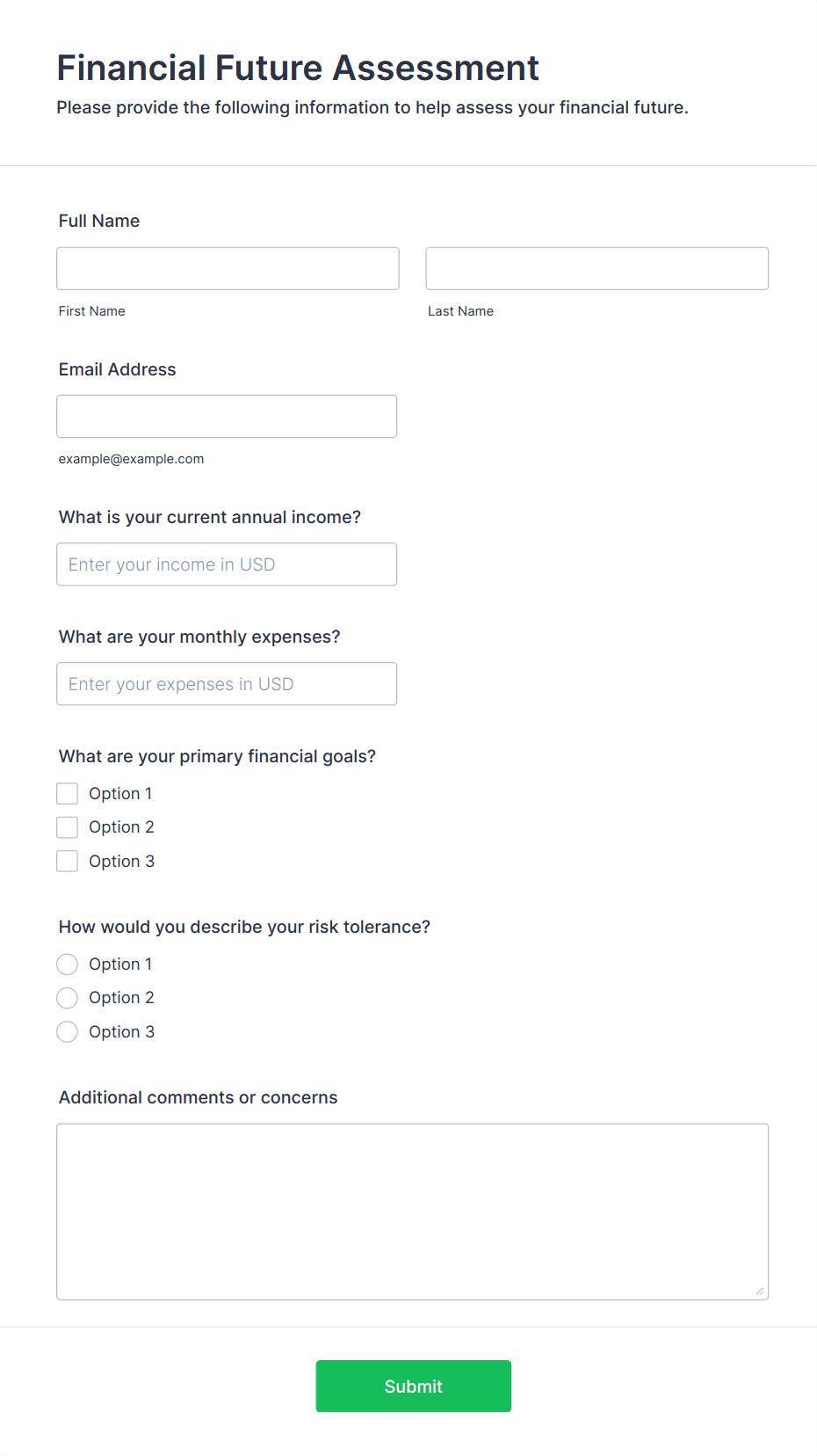 Give your clients peace of mind with Jotform’s secure online Financial Advisor Forms. From any device you can gather client intake information, W4 and W9 data, and finance declaration forms and applications. Choose from one of our free form templates below, and customize it to make it your own without any coding with just a few clicks. Drag and drop to edit premade text fields and checklist items, add your own personal branding, install widgets, choose fonts and colors, and more. You can also charge clients directly from your form with our 30+ payment processor integrations — which charge no additional transaction fees. Sensitive client information is instantly synced and stored in your secure online account. Create a seamless intake process for your clients with our free Financial Advisor Forms.