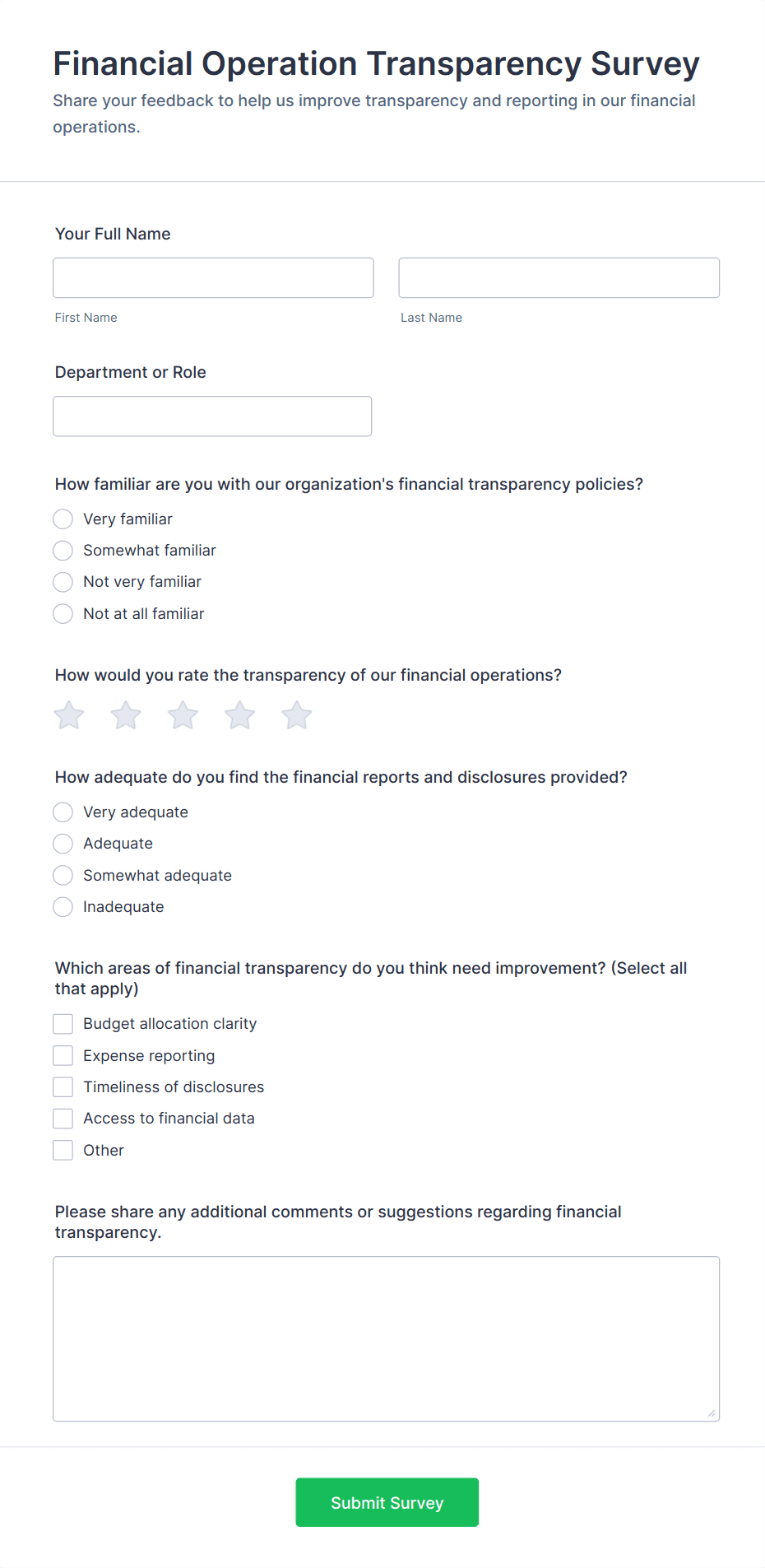 For employee surveys, consider adding anonymity options; for customer surveys, include contact fields if follow-up is needed.
