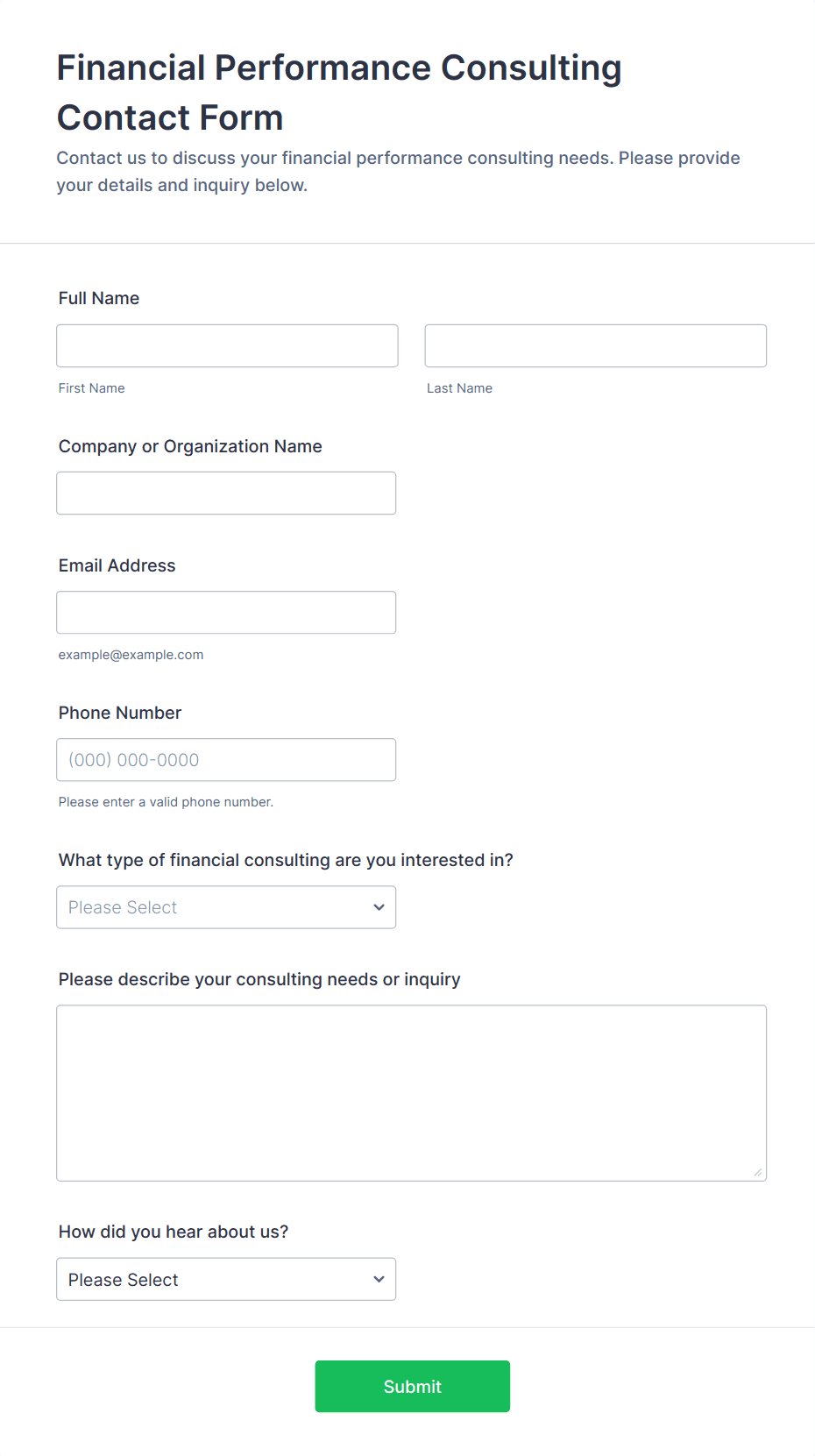• Client Intake Forms: Focus on collecting contact details, business background, and initial goals.