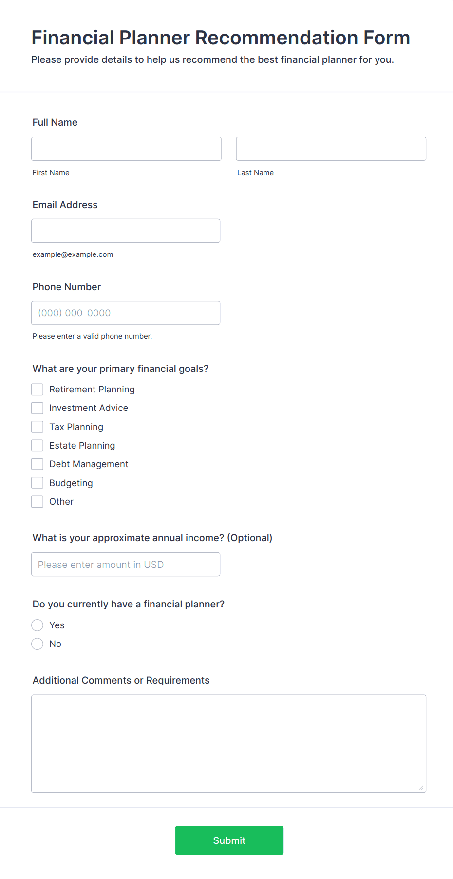 Give your clients peace of mind with Jotform’s secure online Financial Advisor Forms. From any device you can gather client intake information, W4 and W9 data, and finance declaration forms and applications. Choose from one of our free form templates below, and customize it to make it your own without any coding with just a few clicks. Drag and drop to edit premade text fields and checklist items, add your own personal branding, install widgets, choose fonts and colors, and more. You can also charge clients directly from your form with our 30+ payment processor integrations — which charge no additional transaction fees. Sensitive client information is instantly synced and stored in your secure online account. Create a seamless intake process for your clients with our free Financial Advisor Forms.