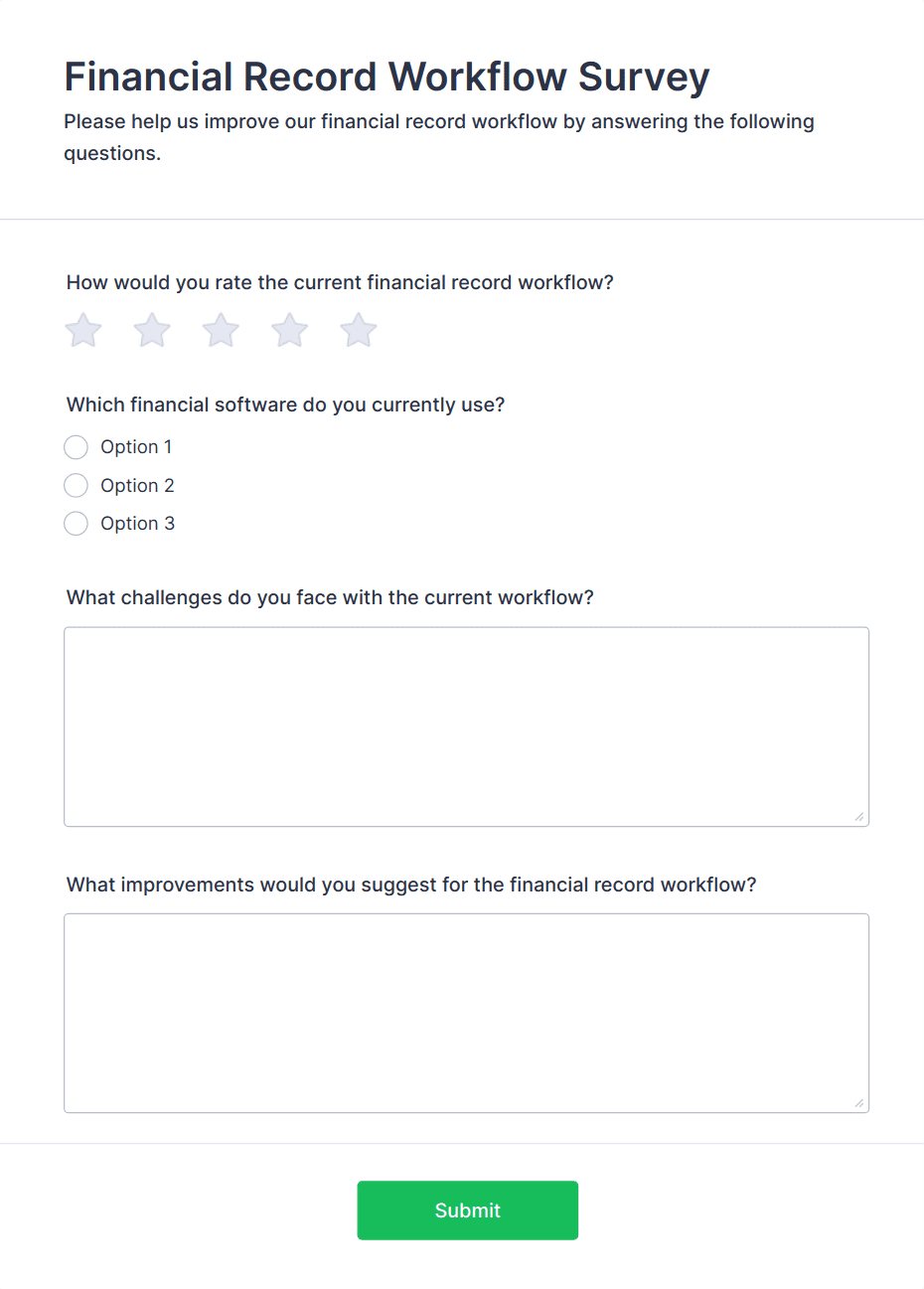 • Content and Fields: Customer surveys may focus on service ratings and open-ended feedback, while employee surveys might include questions about workplace environment and leadership. Market research surveys often use demographic fields and multiple-choice questions, whereas product feedback forms may include rating scales and feature-specific queries.