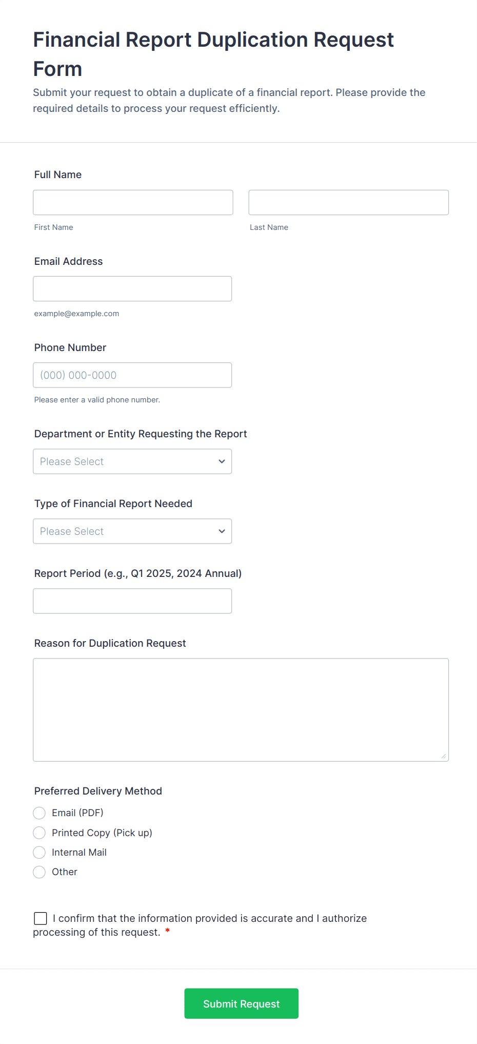 • Financial Reports: Require fields for numerical data, dates, and categories.