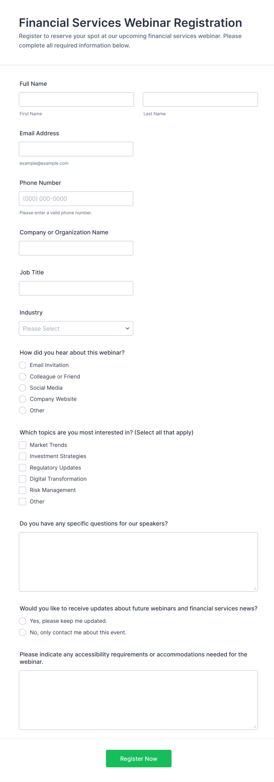 - Use conditional logic to show or hide fields based on user responses (e.g., only display payment fields if a paid session is selected).