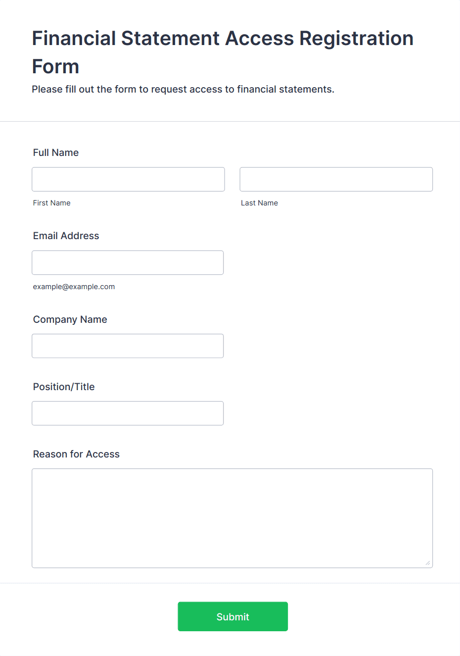 The form templates here are for informational purposes only. Jotform is not providing legal, financial, or other advice, or implying that the forms are legally valid in all or any jurisdictions. Before using any such form, consult an attorney and/or other applicable professionals to make sure that the form meets your needs, legally and otherwise.