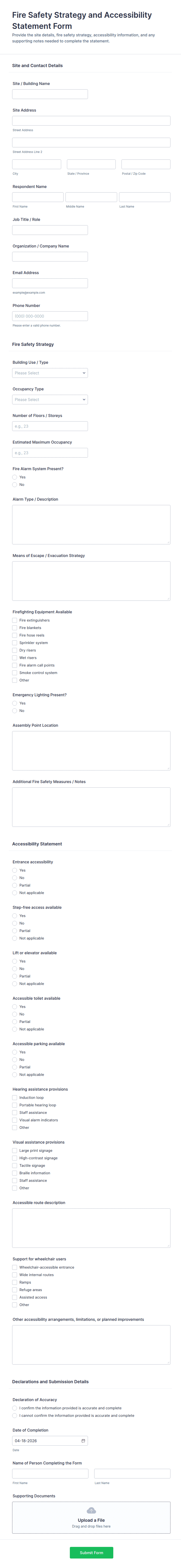 Document site fire-safety checks consistently with the Fire Hazard Risk Assessment Form, ideal for facility teams and property managers who need reliable data collection and centralized form submission records in Jotform.