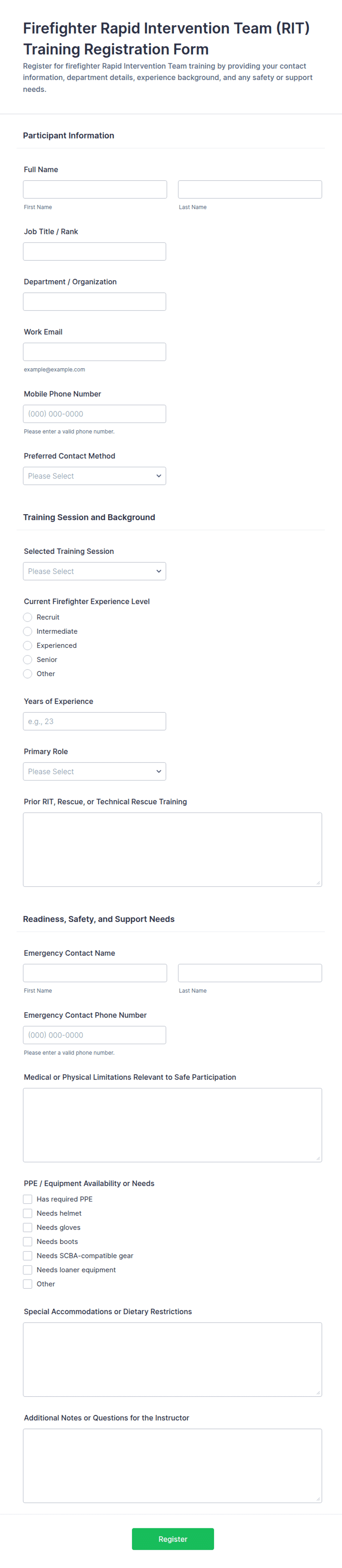 Collect RIT training registrations with this Firefighter Rapid Intervention Team (RIT) Training Registration Form, built for departments and instructors who need to manage session signups, participant details, and readiness information online.