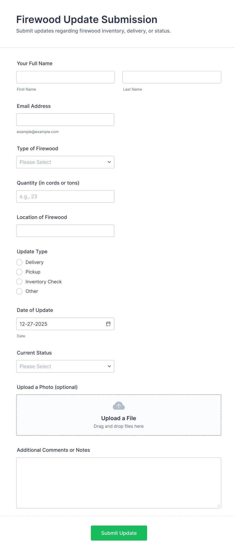• Inventory Tracking: Forms may include fields for item name, SKU, quantity, location, and restock dates.