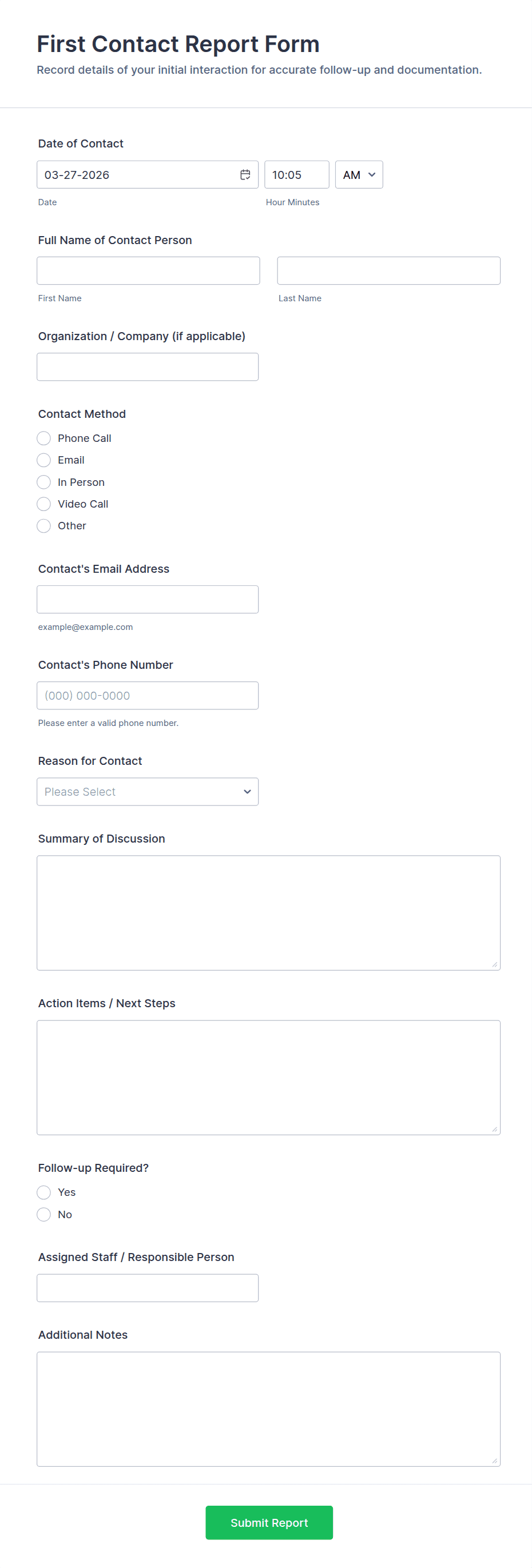 • For business reports: Include fields for dates, metrics, comments, and file uploads.