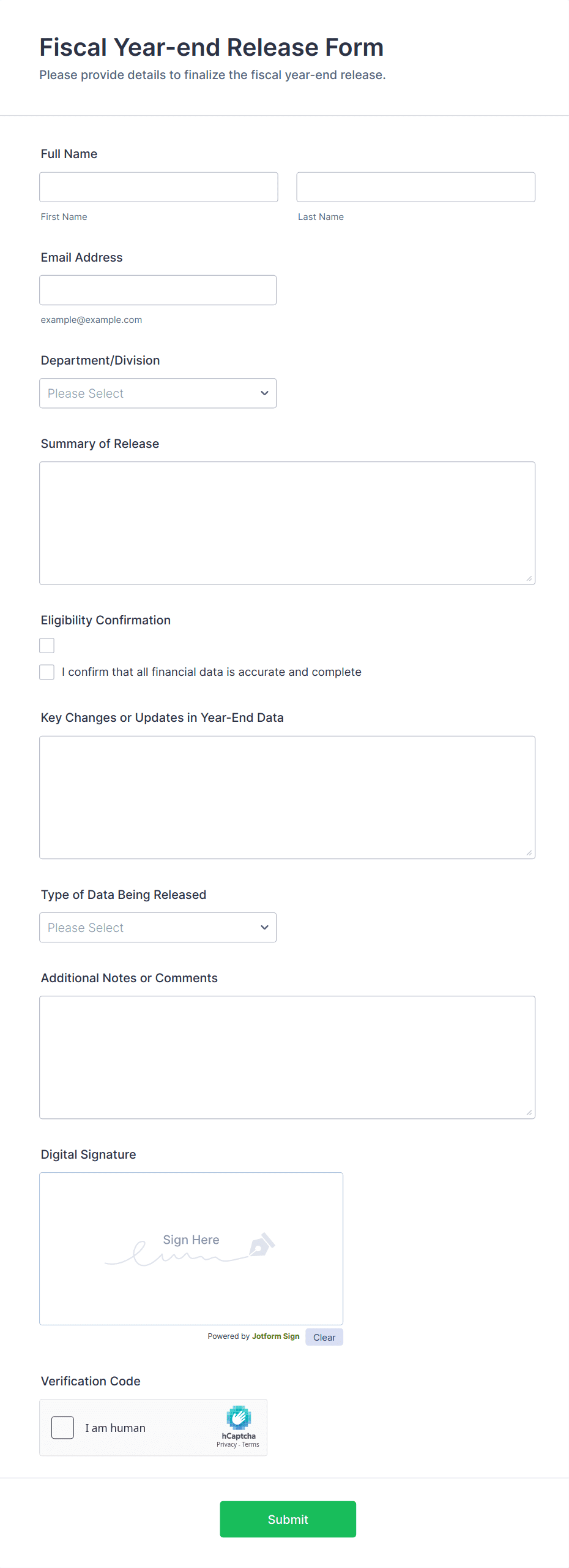 The form templates here are for informational purposes only. Jotform is not providing legal, financial, or other advice, or implying that the forms are legally valid in all or any jurisdictions. Before using any such form, consult an attorney and/or other applicable professionals to make sure that the form meets your needs, legally and otherwise.