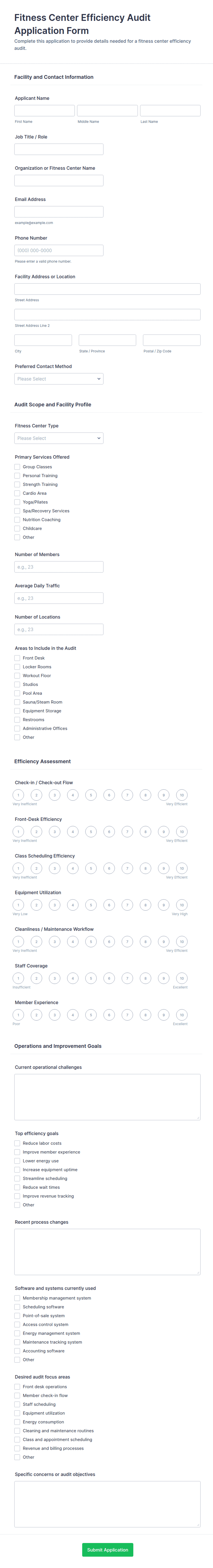 Audit forms are specialized tools designed to systematically evaluate, inspect, or review processes, operations, compliance, or assets within an organization. These forms are commonly used in industries such as finance, healthcare, manufacturing, education, and hospitality to ensure adherence to standards, identify areas for improvement, and document findings. Audit forms can cover a wide range of scenarios, including safety inspections, quality control checks, compliance audits, internal process reviews, and facility assessments. By providing a structured format for data collection, audit forms help organizations maintain accountability, track corrective actions, and support continuous improvement initiatives.