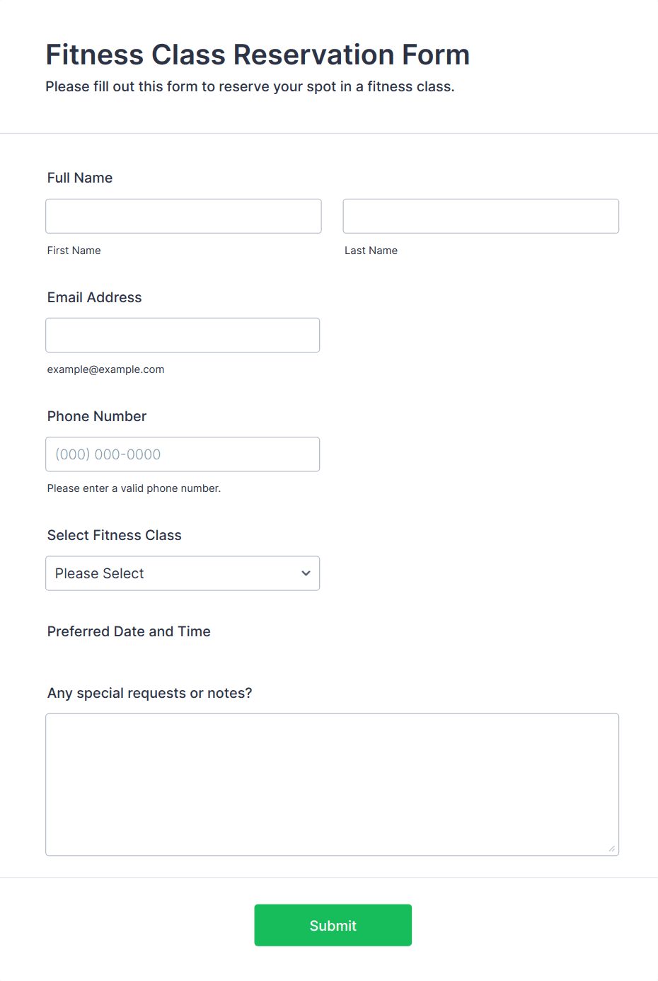 Common fields include name, contact details, date and time of booking, service or resource selection, number of participants, and payment information if required.