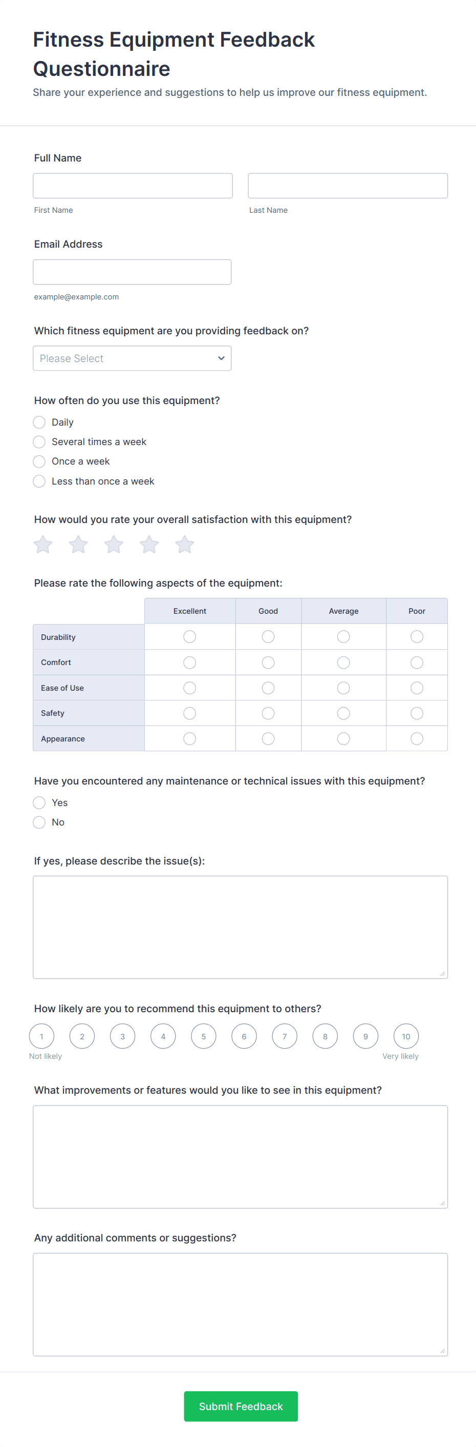 • Product feedback forms may include questions about usability, features, and likelihood to recommend.