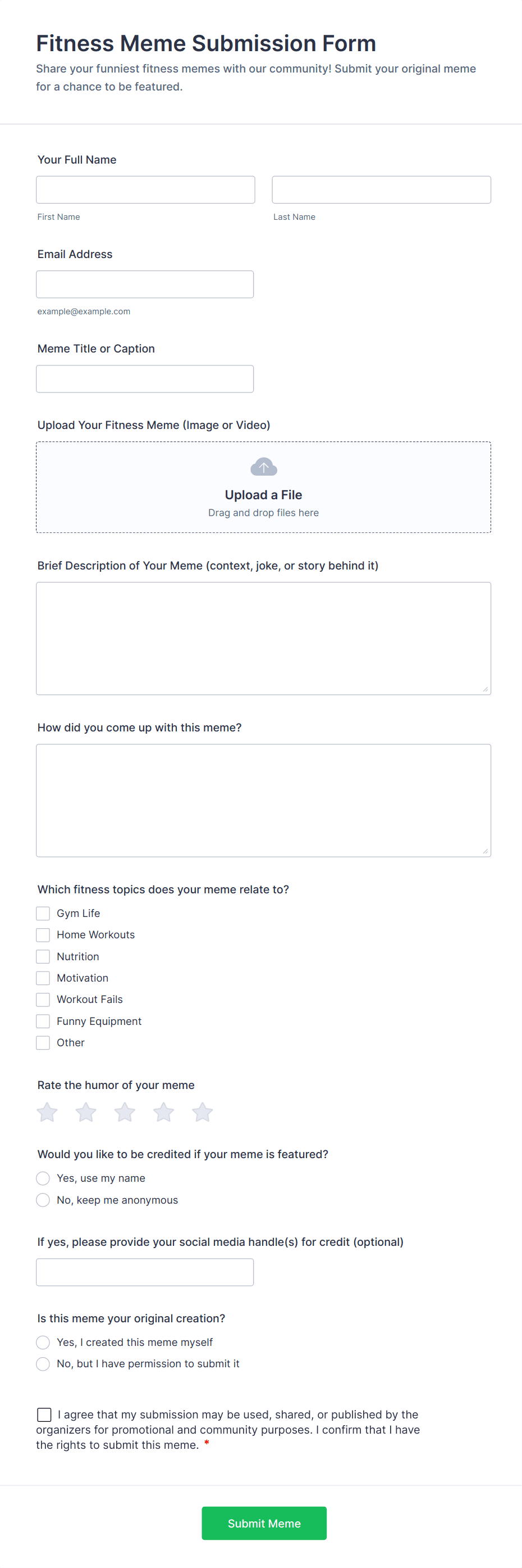 • File upload fields for photo, video, or document submissions.