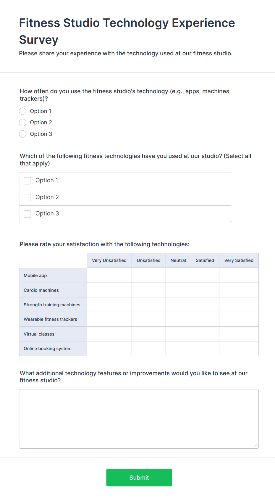 Survey templates are pre-designed forms that help individuals and organizations collect feedback, opinions, or data from a target audience. These templates are widely used for a variety of purposes, such as customer satisfaction surveys, employee engagement assessments, market research, event feedback, and academic studies. By providing a structured set of questions, survey templates streamline the process of gathering valuable insights, making it easier to analyze trends, measure satisfaction, and make informed decisions. Whether you’re a business owner, HR professional, educator, or researcher, survey templates offer a quick and effective way to reach your audience and collect actionable information.