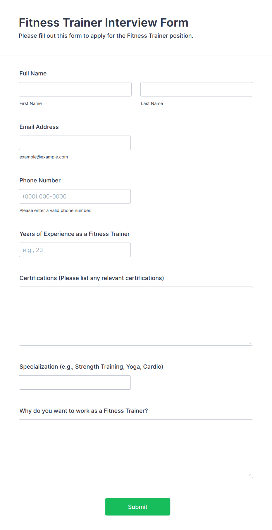 This responsive interview questionnaire form is built with love for mobile. This interview questionnaire form optimized for smartphones and tablets, this makes it easy to fill on mobile devices. It has two columns interface with modern design. If you're going to interview someone for a job, use this online responsive survey template so applicants can easily fill this form and submit their answers. Use this interview questionnaire form template so you can customize it in the form builder like add/edit interview questions.