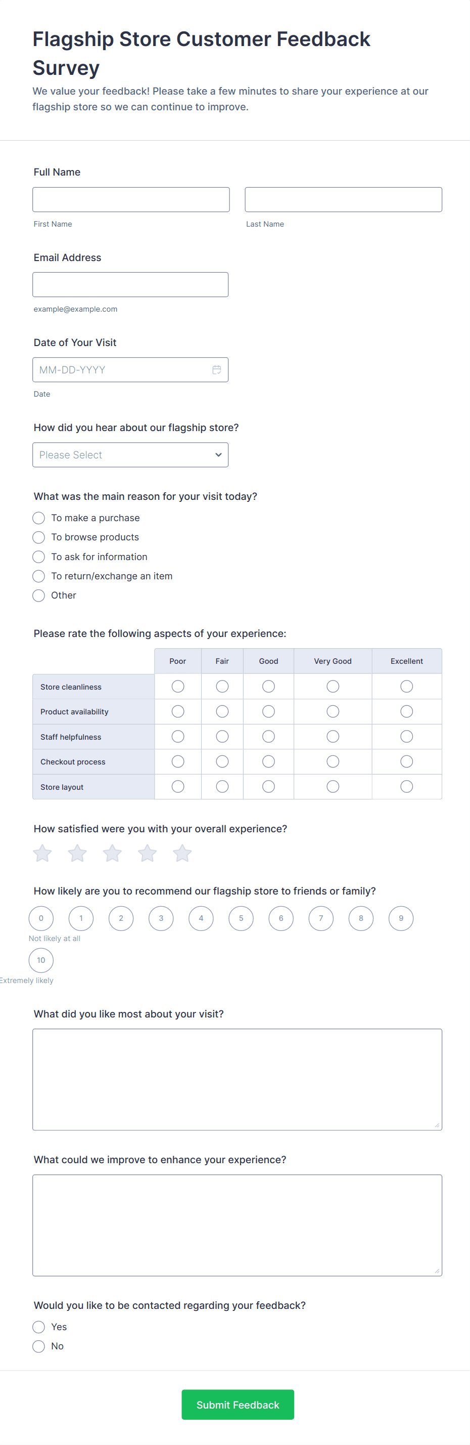 • For customer feedback, include questions about satisfaction, product quality, and likelihood to recommend.