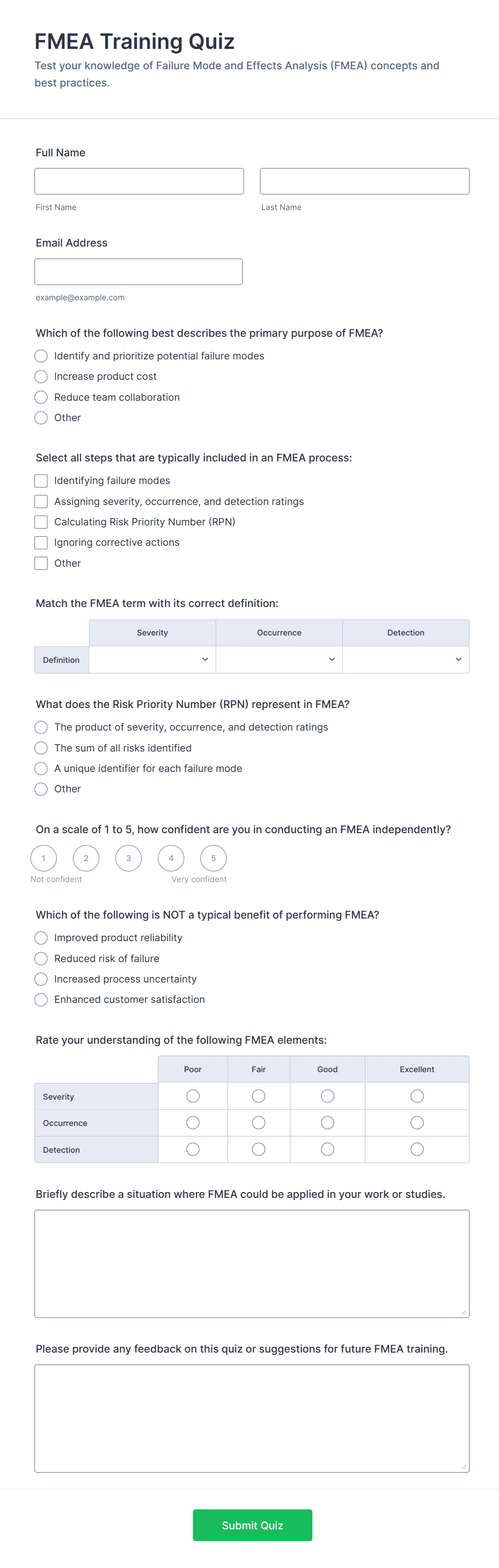 - Pre-Training Assessments: Use multiple-choice, dropdowns, and short text fields to gauge baseline knowledge.