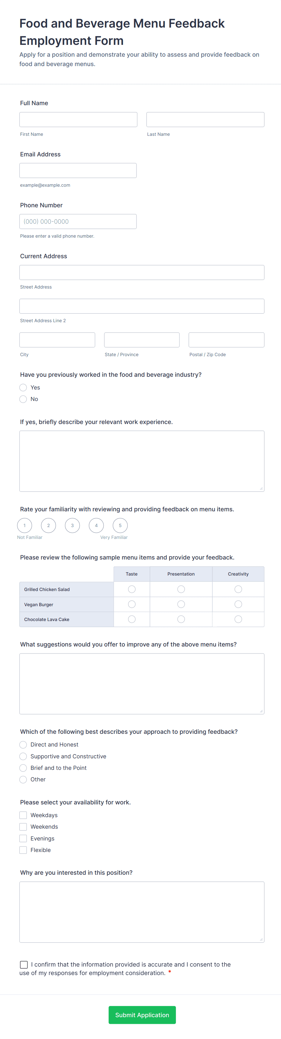 - For Job Applications: Name, contact info, education, work history, resume upload, screening questions.