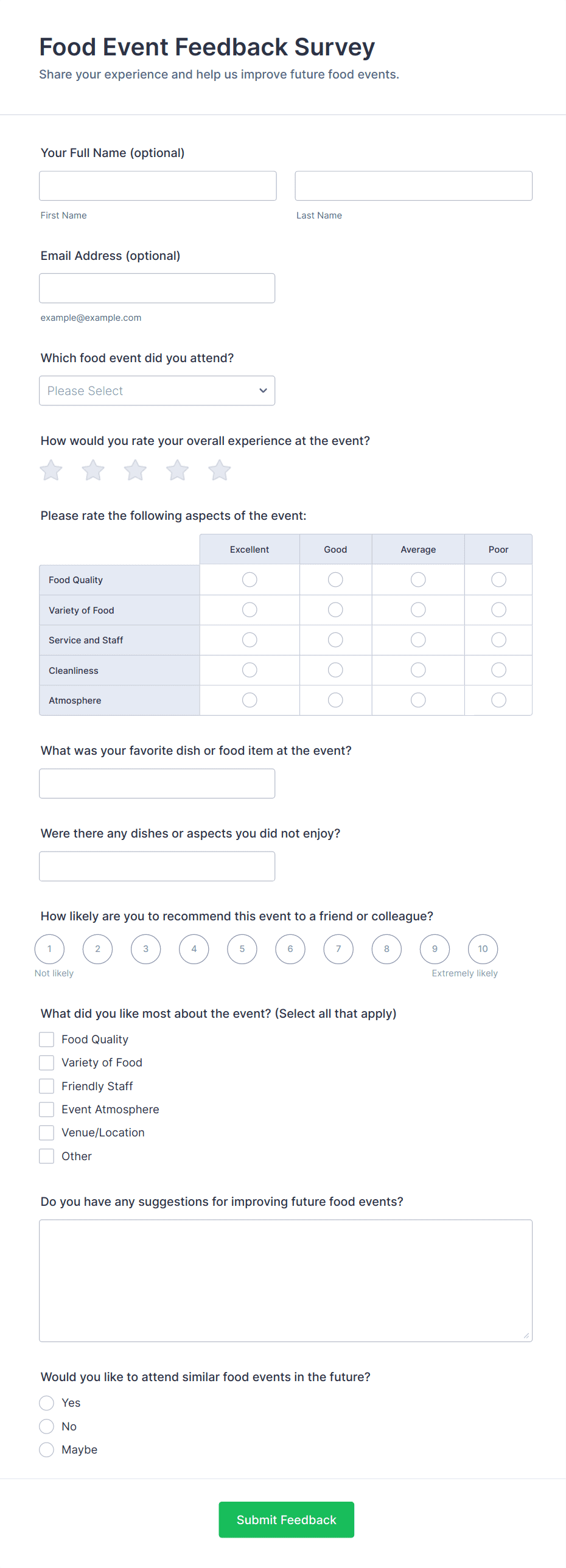 • Multiple choice or dropdown questions for specific event aspects (venue, food, logistics)