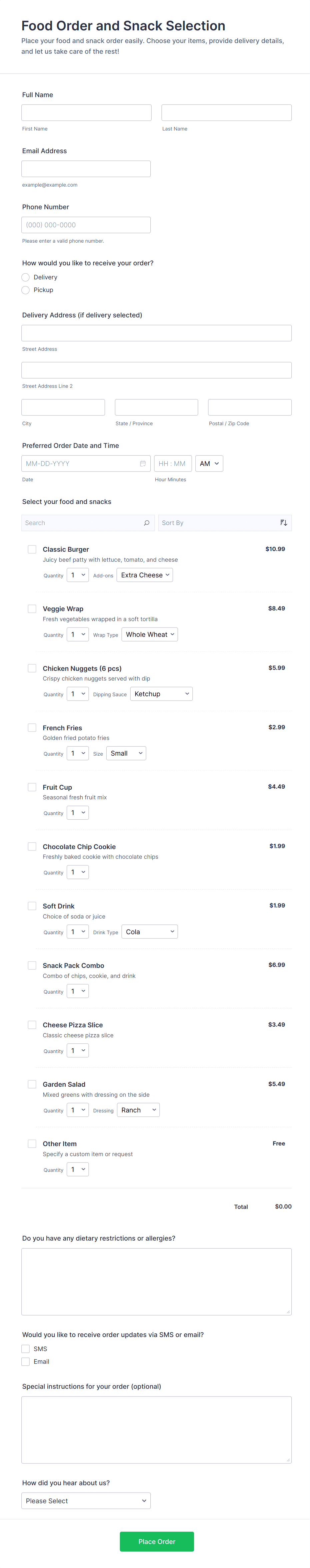 • Restaurant Orders: Forms may include menu item selection, modifiers (e.g., size, toppings), delivery address, and payment integration.