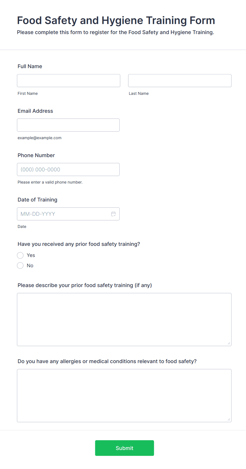 Training forms are specialized digital documents designed to streamline the process of organizing, managing, and evaluating training programs. These forms can be used for a variety of purposes, such as employee onboarding, skills assessments, training feedback, course registrations, pre-training surveys, and post-training evaluations. Organizations of all sizes — from corporate HR departments to educational institutions and training consultants — rely on training forms to collect essential information, track participant progress, and ensure that learning objectives are met efficiently.