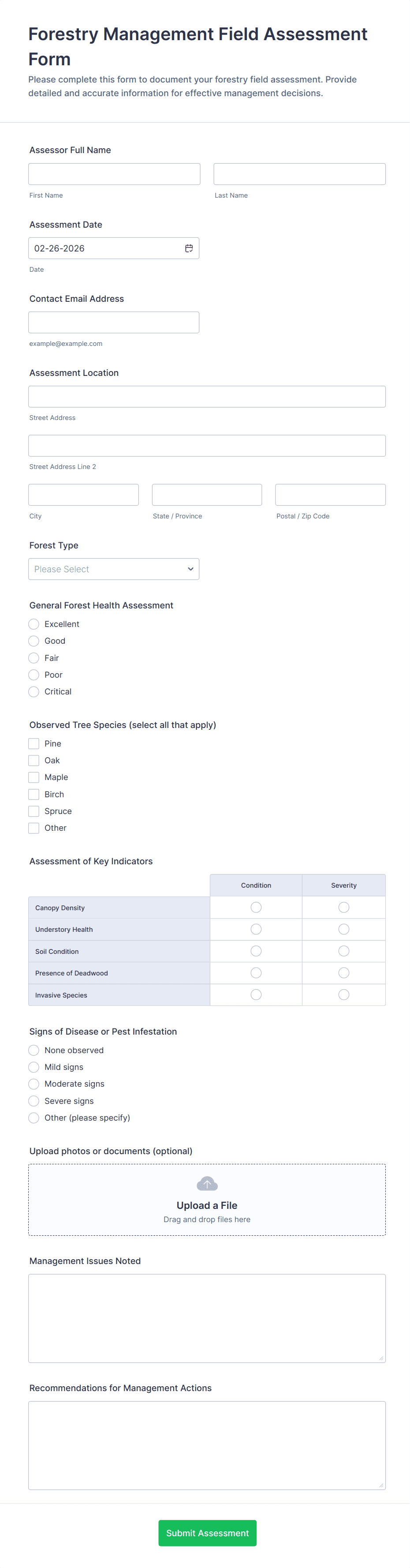 Collect consistent field observations with the Forestry Management Field Assessment Form for forestry teams, land managers, and conservation groups, and centralize every form submission in Jotform for faster review and planning.