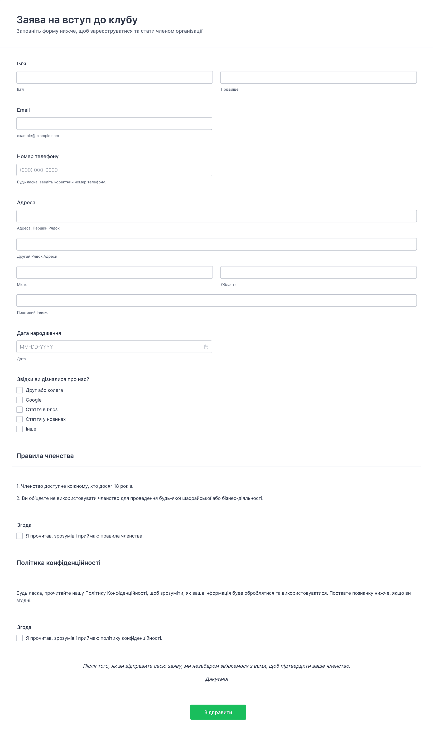 A membership application form (or membership form) is a document used by social and recreational organizations to collect information from prospective members.