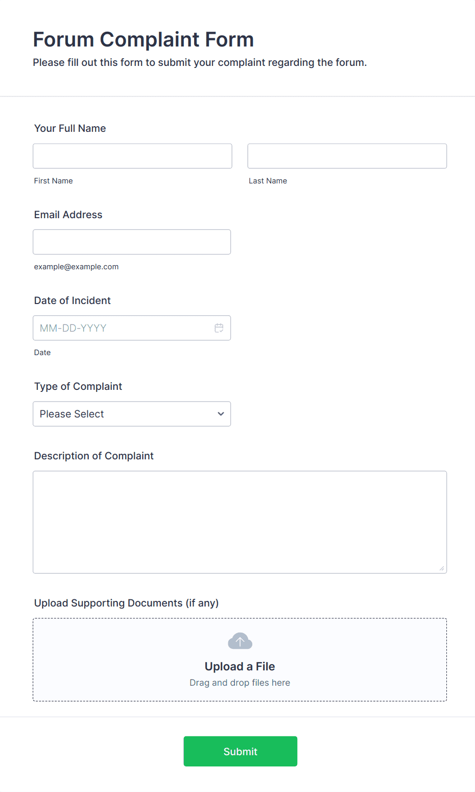 • Use conditional logic to show or hide fields based on user responses (e.g., display additional questions if the complaint is about a specific service).