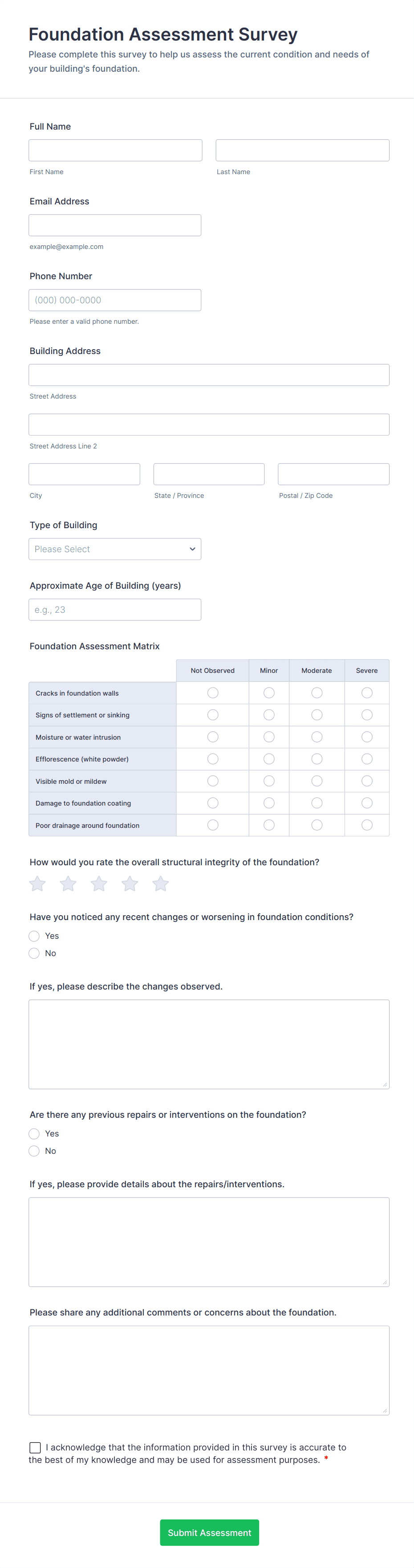 An assessment form is a questionnaire used to make assessments with all necessary metrics included. Go online with no coding!