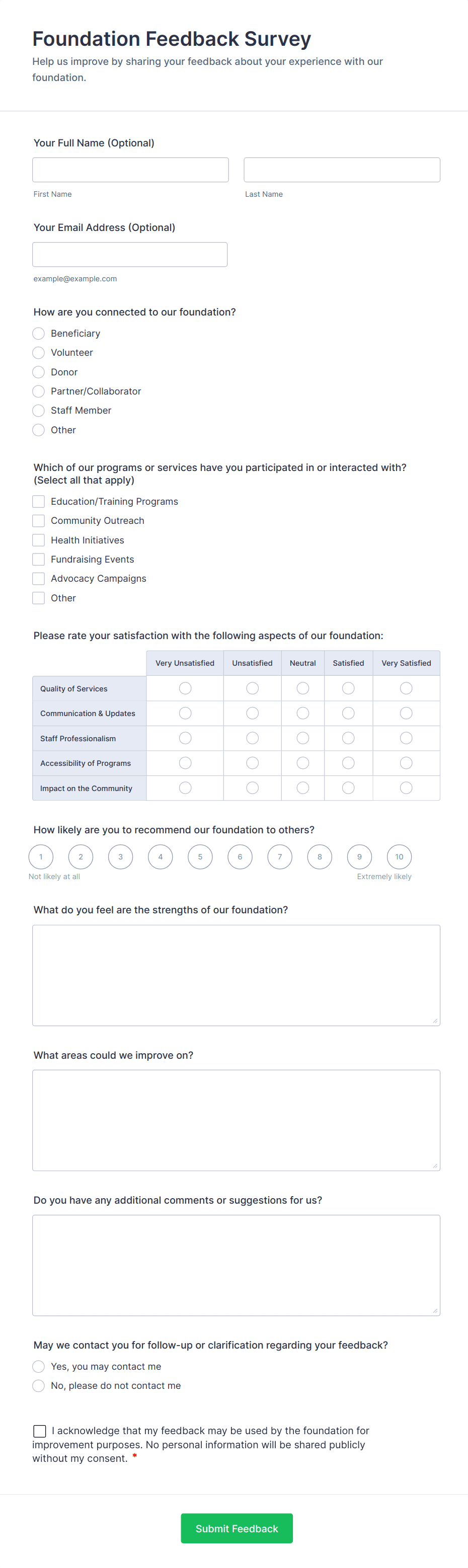 By following these steps, you can create a feedback survey that is tailored to your audience, easy to complete, and delivers actionable insights for your organization.