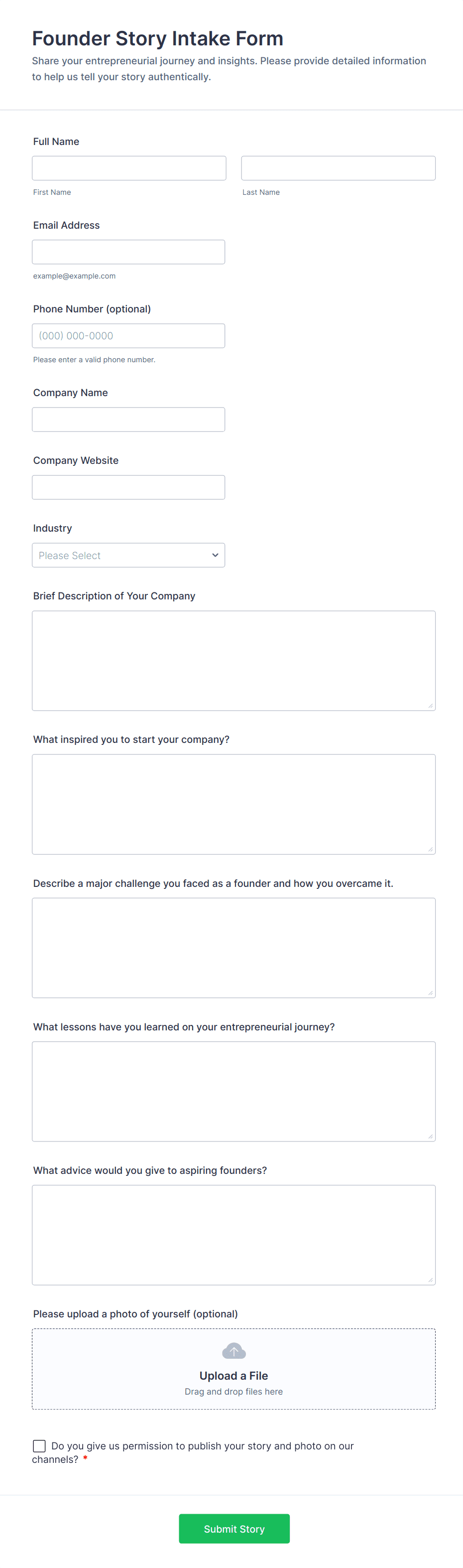 Fulllscreen, elegant and modern looking share your story form template. This form is generally used for collecting customer's experience or testimonials.