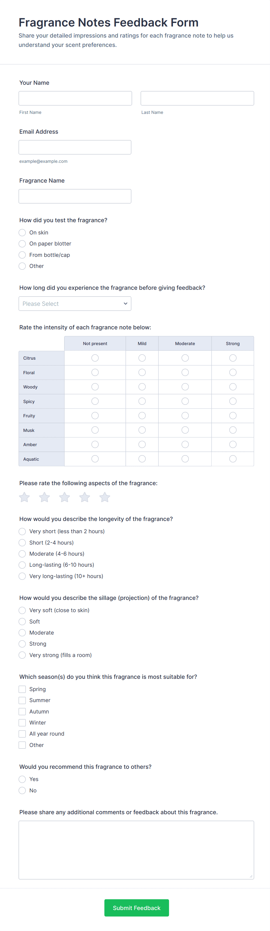 • Short and long text fields for open-ended feedback.
